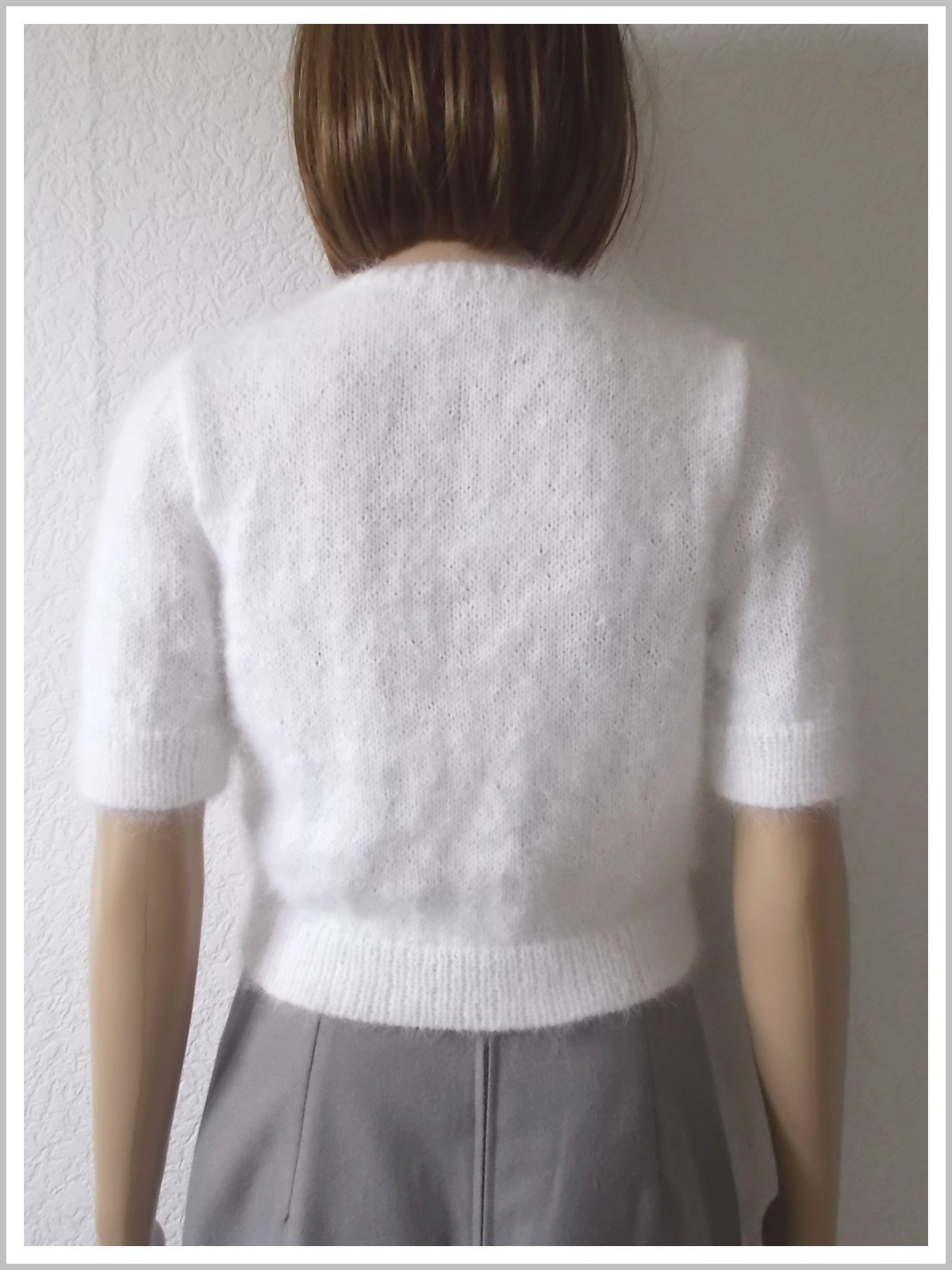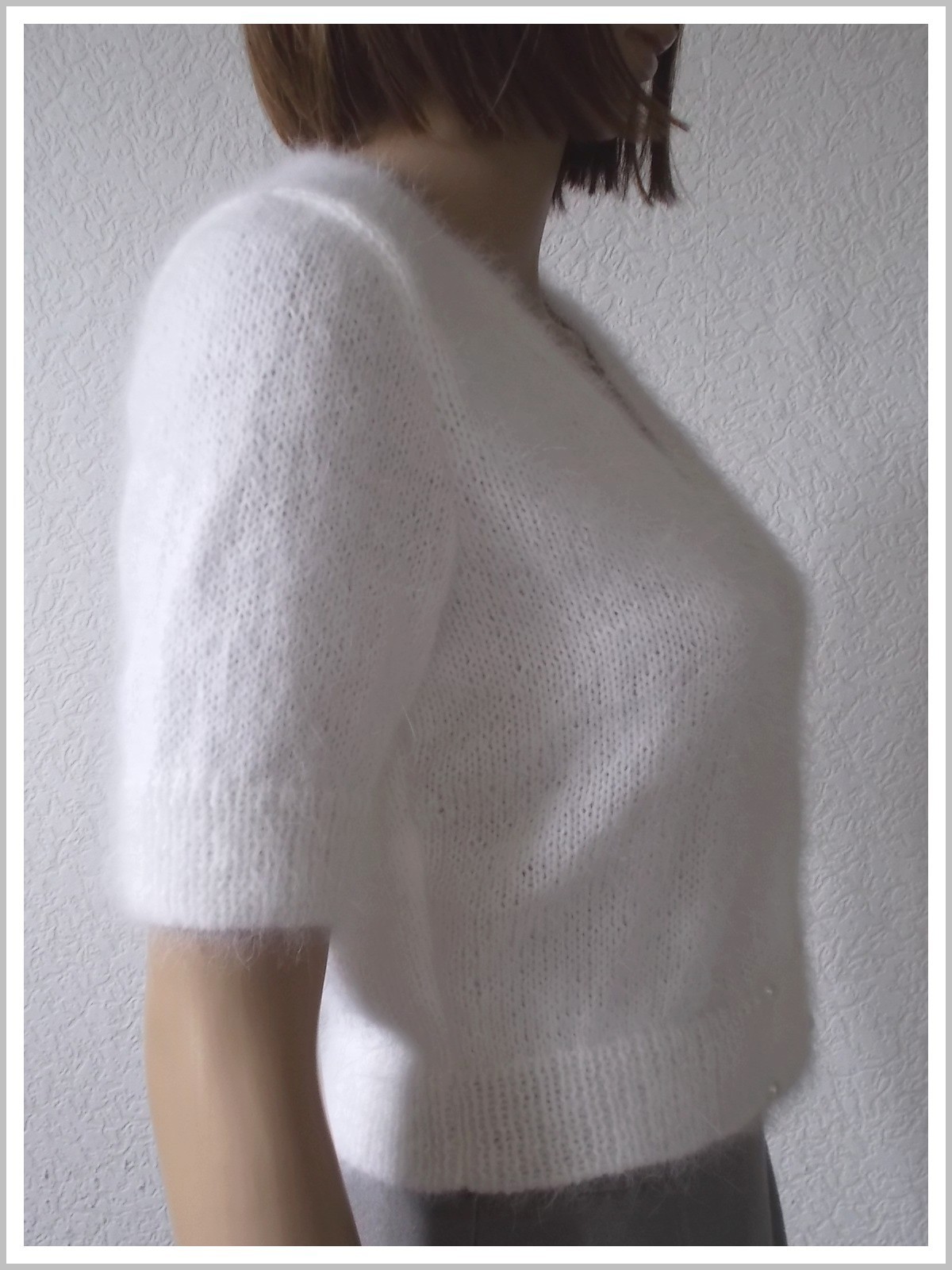 Cache-cœur femme à manches courtes, tricoté main au point jersey en 80 % angora français et 20 % mérinos coloris blanc, bords côtes 1/1. Croisé et fermé devant par 4 boutons perles coloris blanc nacré. Création personnelle disponible en taille 38.