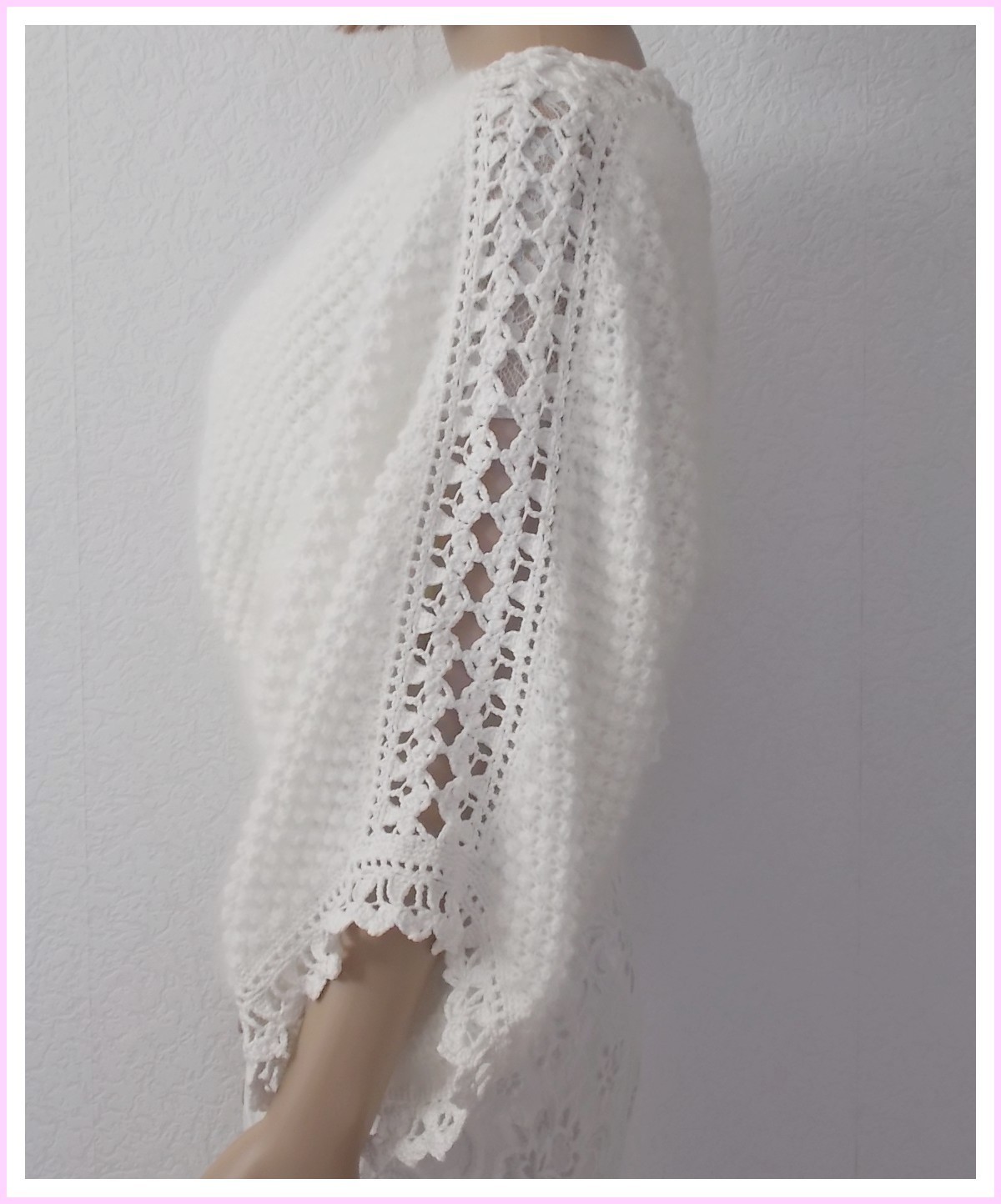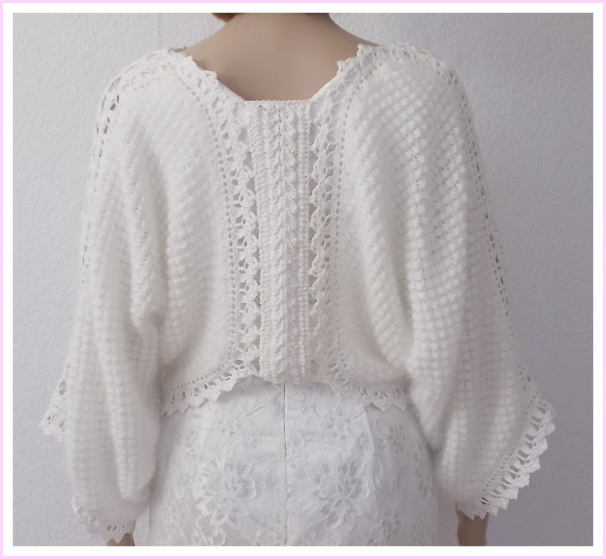 Gilet boléro de cérémonie, tricoté main au point astrakan en fil 100 % angora Prestige ANNY BLATT coloris blanc, finitions crochet en fil 100 % soie CARDIFF coloris blanc.