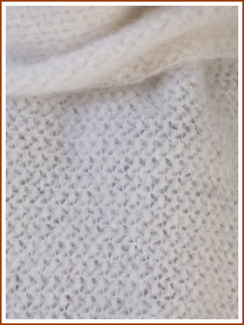 Écharpe crochetée main au point fantaisie en 90 % kid mohair et 10 % microfibre coloris blanc. Dimensions 148 cm × 28 cm environ. Création personnelle réalisable dans d'autres dimensions et couleurs, le prix pouvant varier suivant le nombre de pelotes utilisé.