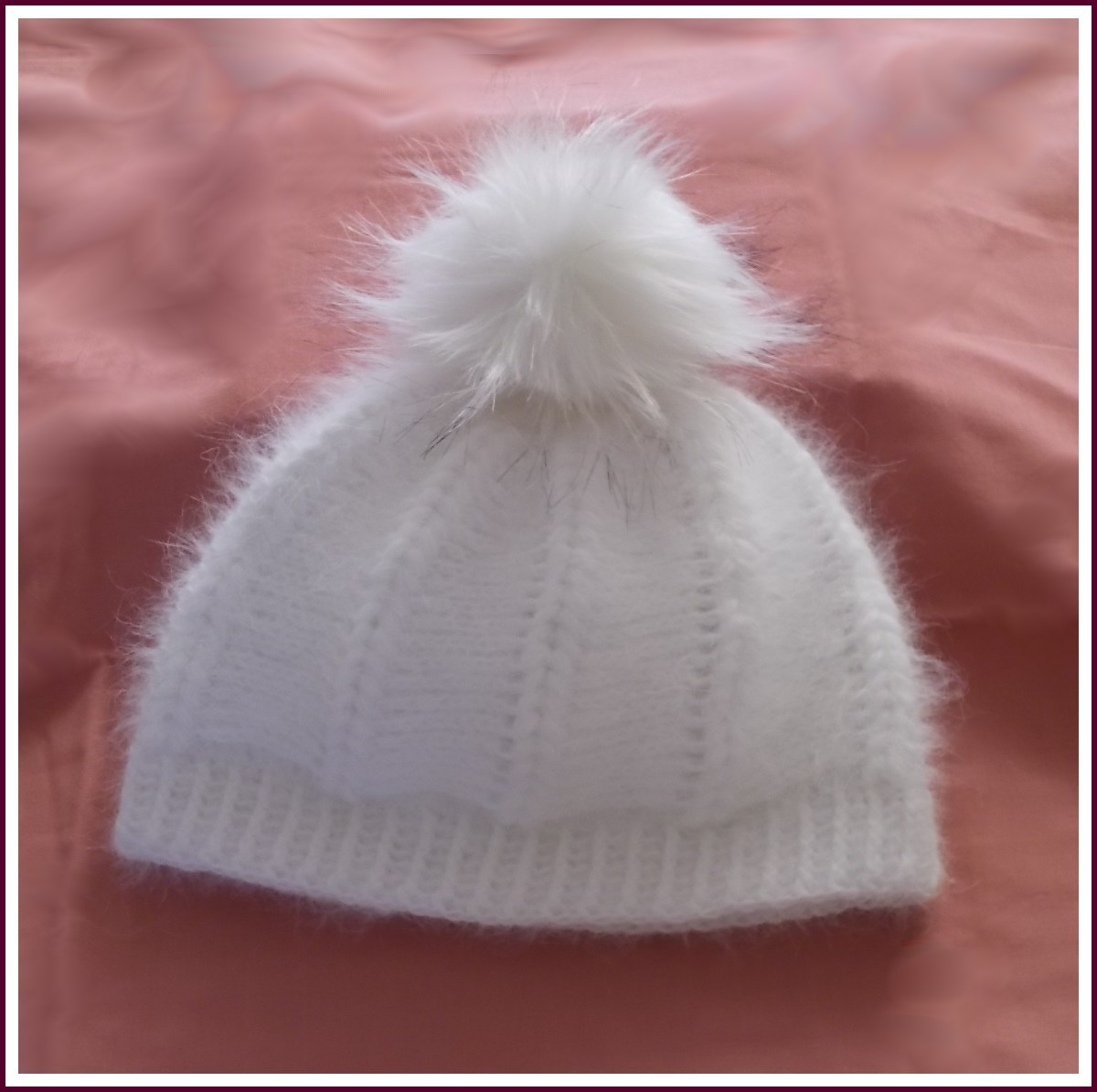 Bonnet à pompon fausse fourrure, crocheté main au point fantaisie en fil 100 % angora ANGORA de FRANCE coloris blanc, pompon cousu coloris naturel.