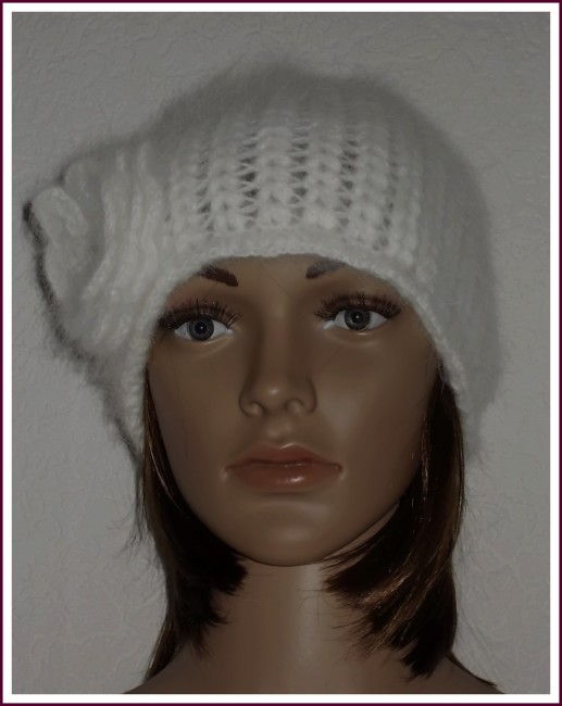 Bonnet crocheté main au point fantaisie en fil 100 % angora ANGORA de FRANCE coloris blanc, fleur amovible assortie crochetée main, montée sur support de broche.