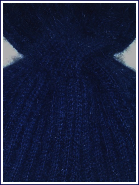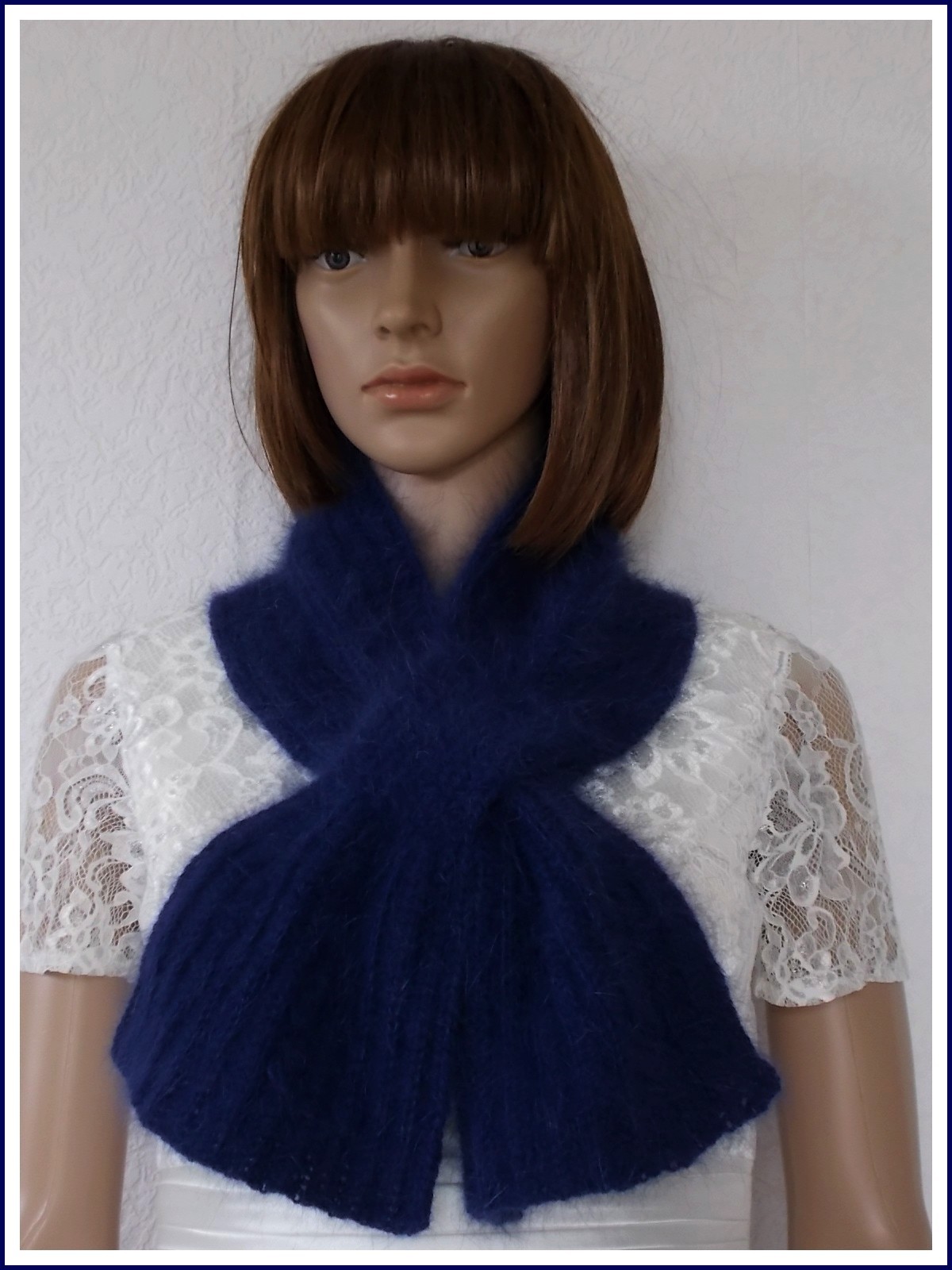 Écharpe croisée crochetée main au point fantaisie en 80 % angora et 20 % mérinos coloris bleu marine. Dimensions 100 cm × 17 cm environ. Création personnelle réalisable dans d'autres couleurs.
