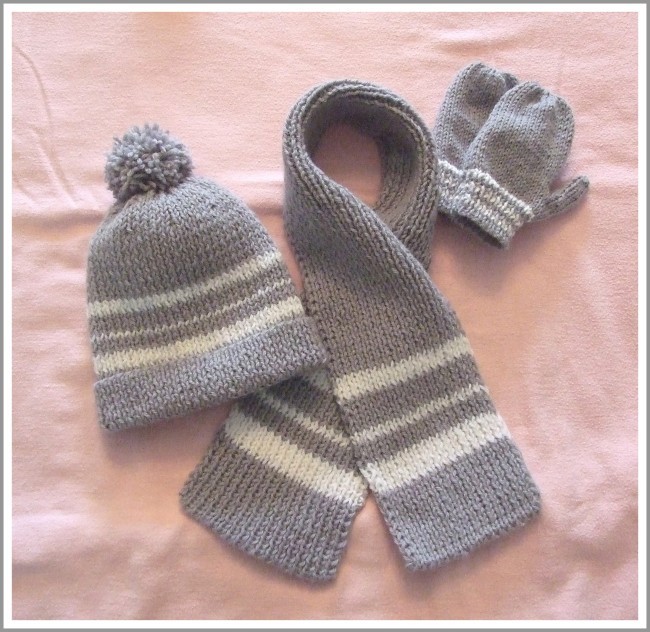 Parure écharpe, bonnet et moufles bicolores fille ou garçon, tricoté main en côtes 1/1 en fil 65 % laine et 35 % alpaga Lima Uni Colour de DROPS coloris gris clair et blanc.