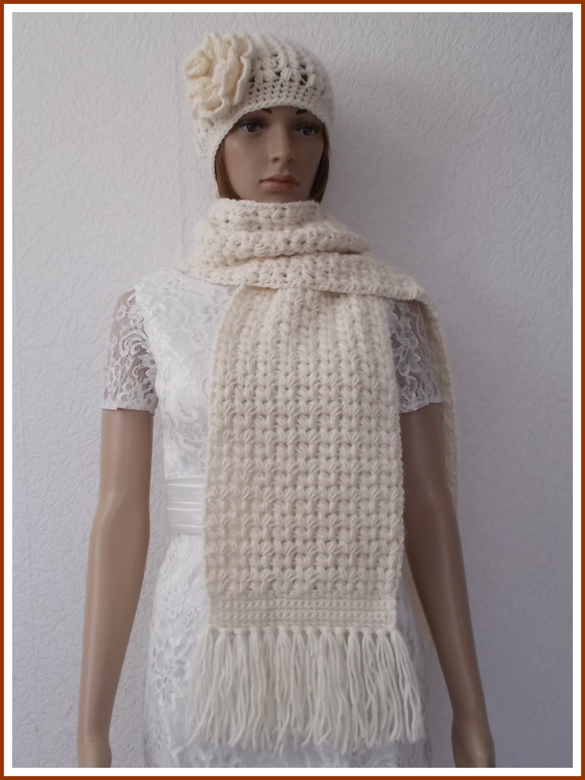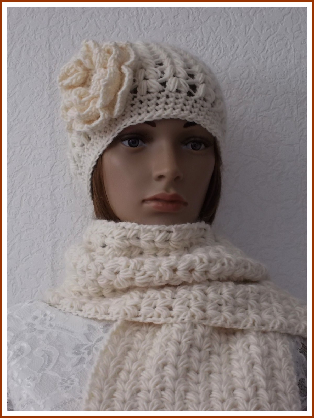 Parure écharpe à franges et bonnet femme, crochetée main au point puff en fil 85 % laine et 35 % alpaga Berkshire de VALLEY YARNS coloris naturel. Rose amovible montée sur support de broche. Création personnelle.