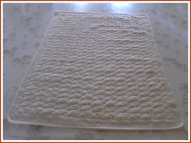 Couverture bébé restangulaire, crochetée main au point fantaisie en fil 85 % laine et 15 % alpaga Berkshire de VALLEY YARNS coloris naturel. Dimension 85 cm × 65 cm environ.