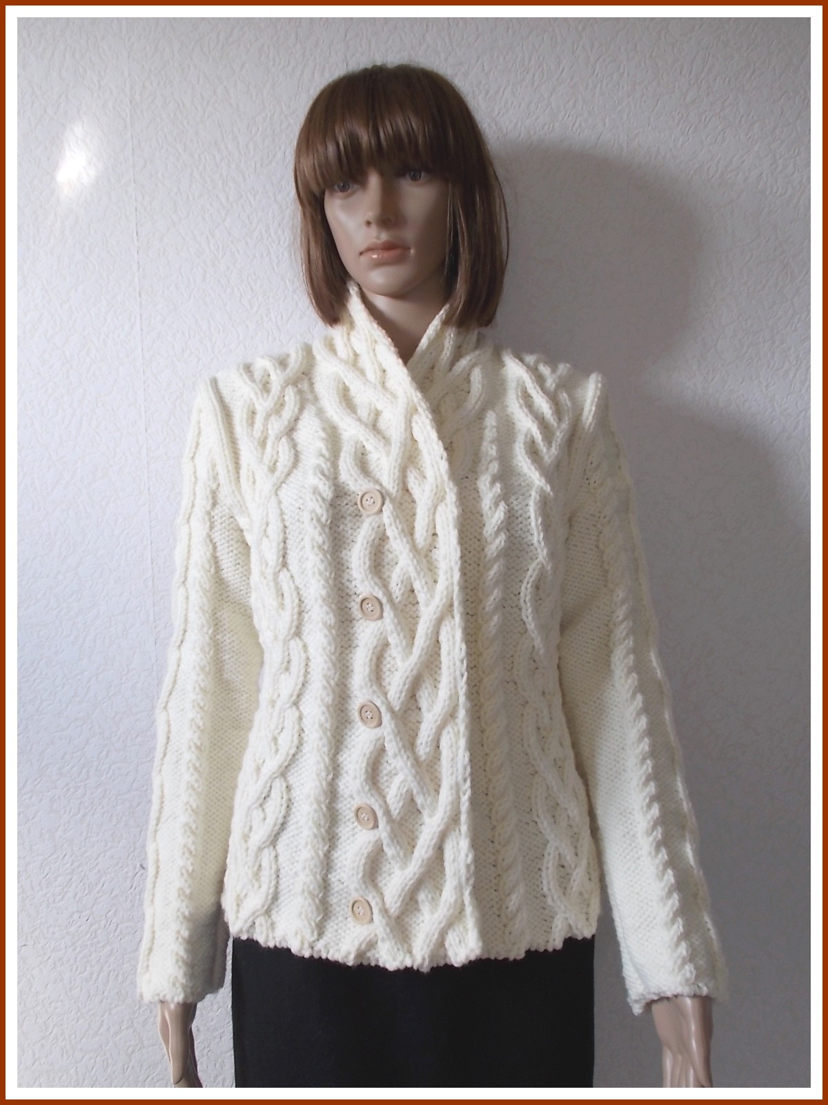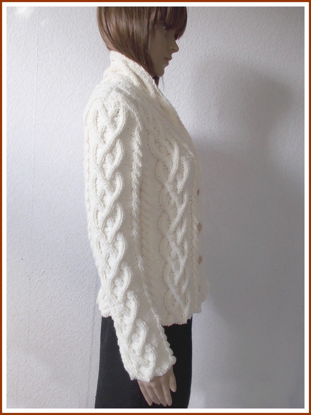 Le gilet fireside porté par Cameron Diaz dans le film "Holiday", tricoté main au point fantaisie torsadé en fil 50 % mérinos et 50 % acrylique SUPER MERINO de KATIA coloris écru. Manches longues et col châle, croisé et fermé devant par 5 boutons bois.